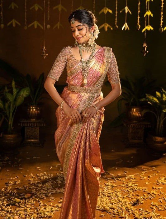 In the softest shade of peach, the delicate folds whisper tales of grace, accompanied by a crystal hand embroidered blouse and a matching waist belt and a hand embroidered veil completing a vison of sheer elegance.
